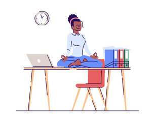 Young woman meditating on workplace flat vector illustration. Stress management. Mental balance. Girl relaxing in lotus position isolated cartoon character with outline elements on white background