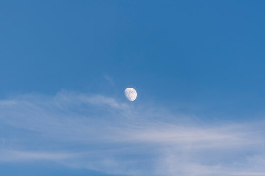 A serene moon captured in a blue daytime sky with soft clouds, conveying calm and peace.
