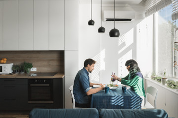 Couple of young adult man and woman enjoy time together sitting on the sofa in indoor leisure activity.. Real life people at home. Male and female relax on the couch reading a book and drinking a tea