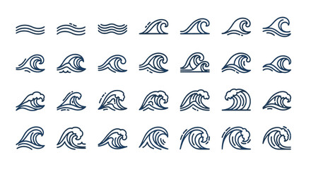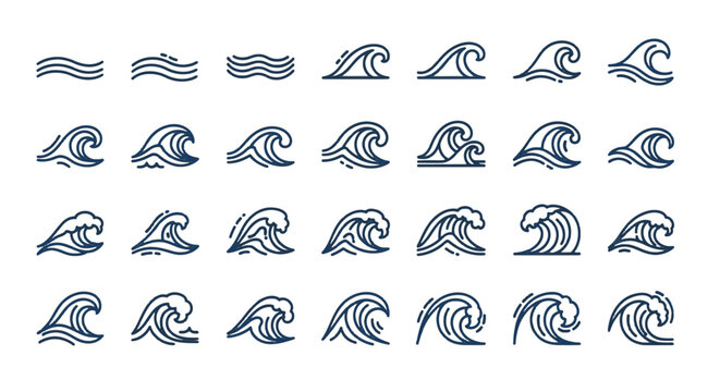Collection of various sea waves, depicted as line art, showcases different shapes and sizes.