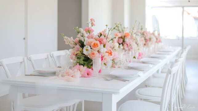 White Table Peach Floral Centerpieces Elegant Minimalist Style High Resolution Soft Lighting Long Table Setting Delicate Blooms Wedding Reception Bright Pastel Tones Ideal for Wedding Planners