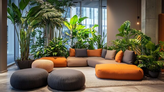 Inviting and relaxing tropical inspired meeting room with plush comfortable seating and lush verdant plants and greenery  This calming biophilic workspace design promotes wellness productivity and