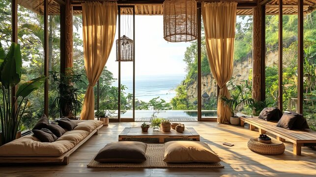 Balinese interior style concept. Cozy, nature-inspired living room with panoramic ocean view.