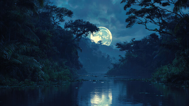 Moonlit river flowing through dense forest concept. Serene moonlit river surrounded by lush tropical foliage.