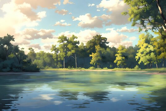 Serene animated landscape of a peaceful river flowing through dense sunlit forest