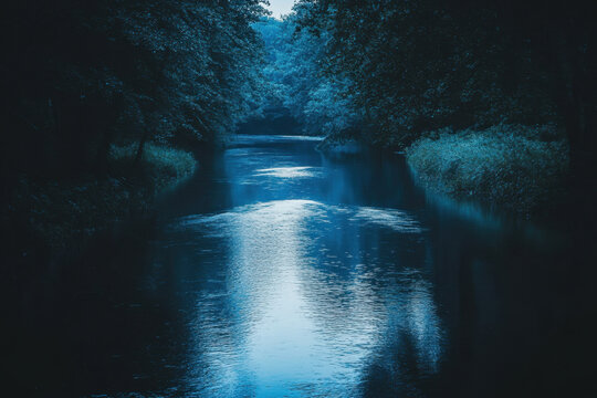 Serene view of a tranquil river flowing through a dense forest under a twilight sky, reflecting deep blue tones and surrounded by lush greenery.