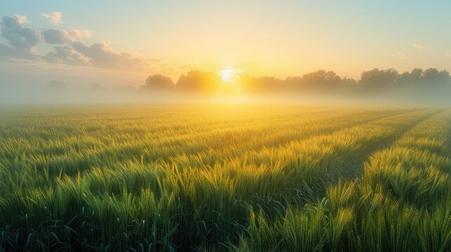 Depict a peaceful scenery backdrop, evocative of well-known stock photo locations such as a calm field at sunrise