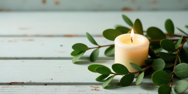 Serene ambiance a lit candle rests gently on a rustic wooden surface, adorned with vibrant green foliage, creating a peaceful and calming atmosphere.