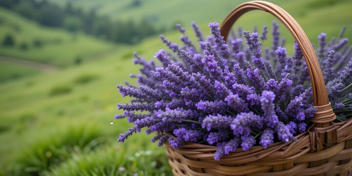 Freshly Harvested Lavender Awaits Use, Its Fragrant Purple Blooms Glistening With Morning Dew. The Basket Sits Peacefully On A Sun-drenched Grassy Hillside. A Serene Moment Captured.