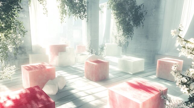 Tranquil minimalist interior with geometric shapes and soft lighting