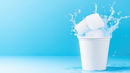 Ice cubes splash into a white cup against a blue backdrop. The image is clean and bright, with a high resolution. The style is minimalist and refreshing. Cool blues and white create a calming mood.