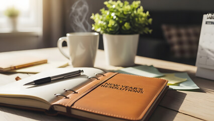 Create a cozy atmosphere with a softlit room featuring a journal and coffee