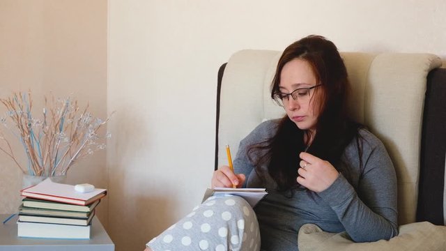 Young caucasian woman writes creative ideas with a pencil.  Brunette girl in glasses writing down her plans in the planner or notes in the notebook. At home.