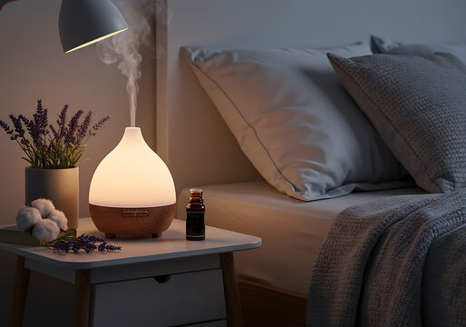 Glowing essential oil diffuser with lavender and chamomile flowers, creating a calming aromatherapy scene