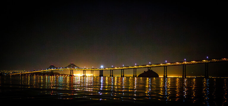 Night view of bridge over water with light reflections.