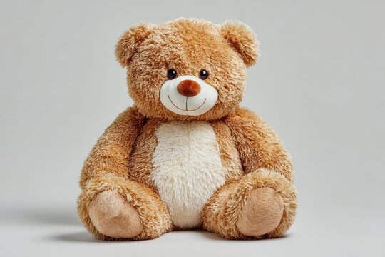 Cute brown teddy bear sitting upright with white paws on a light gray background in a soft studio light, perfect for a gift or decoration