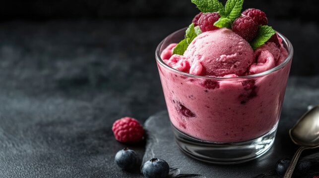 Pink raspberry ice cream dessert, topped with fresh raspberries and mint, in a glass bowl on a dark slate surface