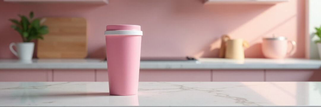 A single pink thermal coffee cup on a marble countertop, thermos, surface
