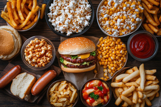 Delicious assortment: burgers, fries, and shakes. Rich colors, tempting presentation. Perfect for a hearty meal or casual get-together.