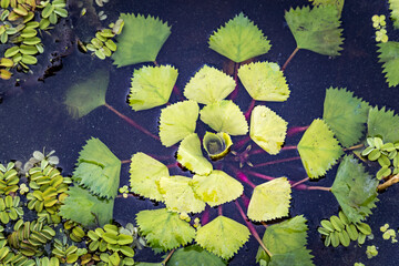 Water caltrop lake. Trapa bicornis (Water Chestnut). Natural pattern of aquatic plants surface.
