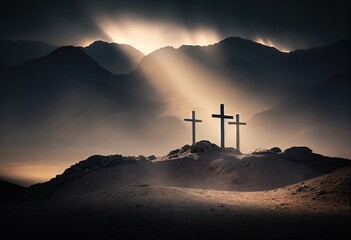 Symbolic Scene: Calvary Crosses Amidst Majestic Mountains and Foggy Sunbeams. Concept. Generative AI.