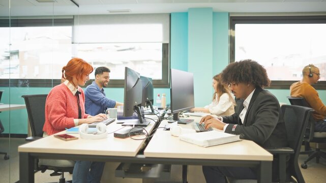 A group of happy colleagues in smart casual wear, posing in a relaxed and friendly office atmosphere.