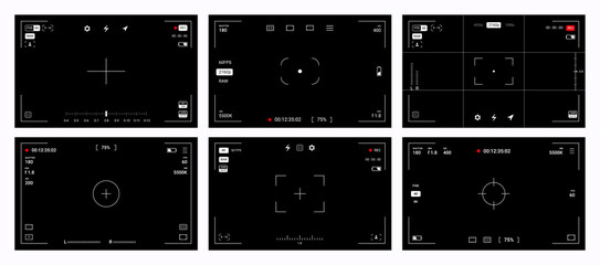 Camera viewfinder. Video record and photography shoot. DSLR screens. Digital camcorder interface. Focusing frame mockup with adjustment buttons. Vector film and photo blank windows set