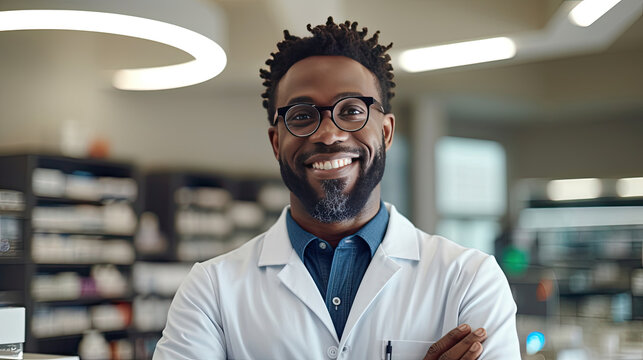 Professional Confident Black Pharmacist Wearing Lab Coat and Glasses, Crosses Arms and Looks at Camera Smiling Charmingly in a pharmacy store. Generative Ai