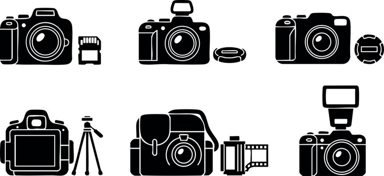 Photography essentials icons set – solid silhouette style for camera enthusiasts and tech lovers: camera, lens, tripod, flash, memory card, photo frame, shutter