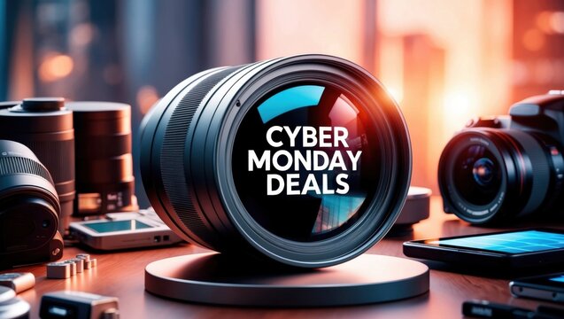 Vintage camera with a percent sign on the lens for sales and promotions illustration