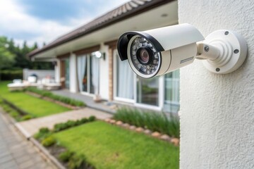 A white security camera is mounted on the external wall of a house, overlooking a well maintained garden. The setting features lush greenery and a cozy outdoor area, creating a serene residential atmo