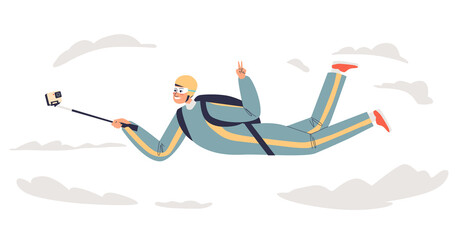 Professional skydiver diving with parachute and make video or selfie on action camera flying