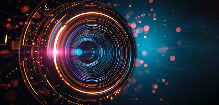 Abstract futuristic camera lens on dark background, space for text