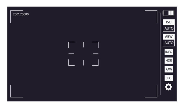 Camera viewfinder. Focusing screen recording. Black screen camera with video shooting parameters, photo quiality indicators. Digital zoom recording for modern bloggers