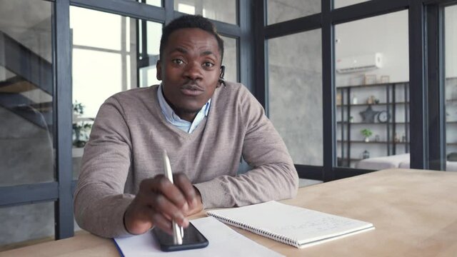 Confident african business man, coach, executive wearing headset talking to camera conference video calling, giving webinar, online class, distance teaching or working at home office, web cam view.