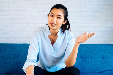 Happy friendly Asian woman looking at camera and talking, making video call conference, online job interview at home. Millennial female internet teacher tutor and vlogger on the job.