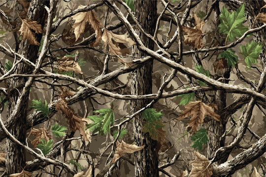Realistic forest camouflage. Seamless pattern. Conifer and oak branches and leaves. Useable for hunting and military purposes.