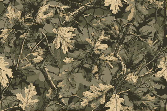 A seamless pattern of camouflage with oak leaves, showcasing the beauty and intricacy of nature.Forest real tree hunting camouflage seamless pattern design for military and hunting uniform.