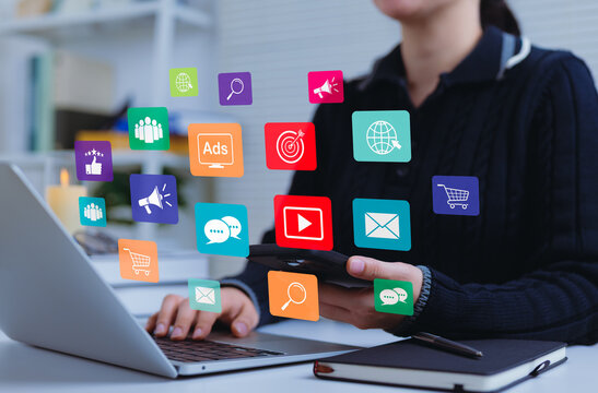 Hands using smartphone with communication icons virtual interface