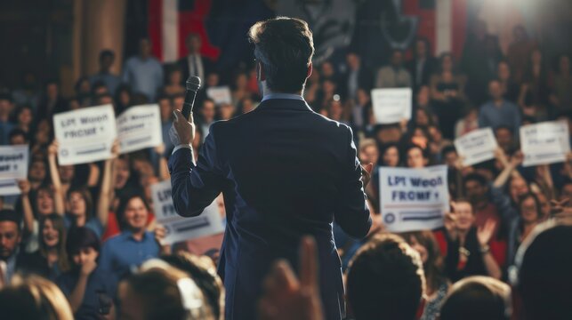 speaker in front of the audience back view, debate, male lecturer speaking in front of a hall of people, the concept of public speaking abstract fictional