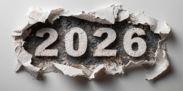 Torn paper exposing embossed 2026 on dark textured background with abstract light area, suitable for New Year marketing, announcements, and creative campaigns