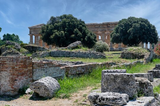 Ancient Greek ruins of Paestum famous UNESCO site in the province of Salerno, Campania, Italy