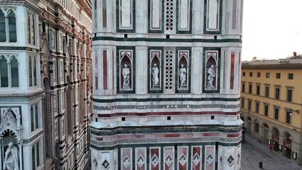 Florence, Italy - 4 January 2025. Night view of Florence Cathedral’s side wall and Giotto’s Campanile, both lit to reveal detailed marble patterns and Gothic windows.