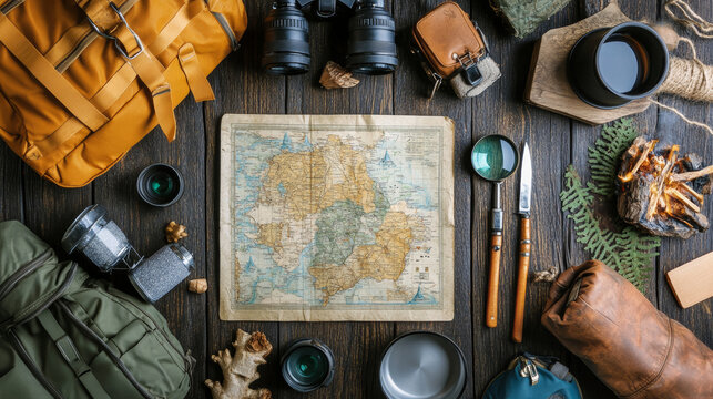 Camp equipment icon and summer adventure hike cartoon set. Campfire element with survival map, tourism cooking food and magnifying glass collection. Binoculars object and journey accessories