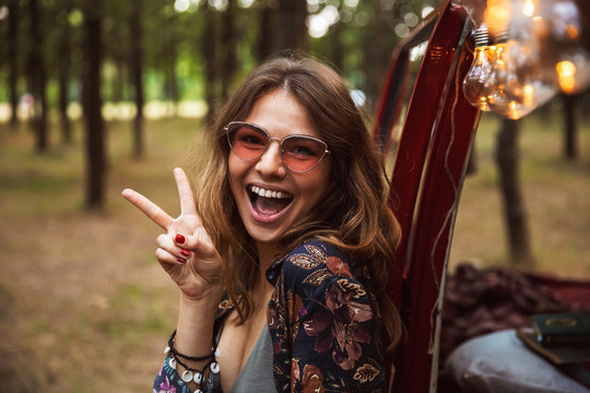 Image of attractive woman 20s, wearing stylish accessories smiling while resting in forest camp