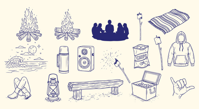 Beach bonfire and campfire vector illustration set. Hand drawn vintage line art of friends, marshmallow, hoodie, cooler, and other camping elements for outdoor and travel design projects.