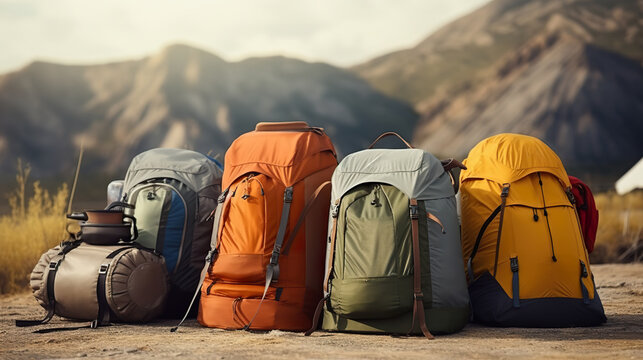 Illustration of travel bags in front of a camping tent, hiking equipment. Sports backpack with a rug near a tourist tent on the background of nature and forest. Generative AI