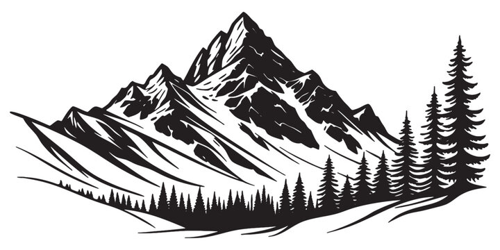 Stunning mountain range illustration with evergreen forest, ideal for outdoor adventure branding and nature-inspired designs
