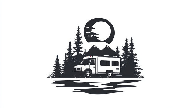 Isolated on white, this powerful black silhouette emblem represents camping, travel, or camper trailers. logo for a campervan or caravanette. A vector element for a motorhome or other vehicle.