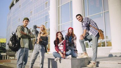 Group of diverse students enjoying their time outside a modern campus building during a sunny afternoon in autumn